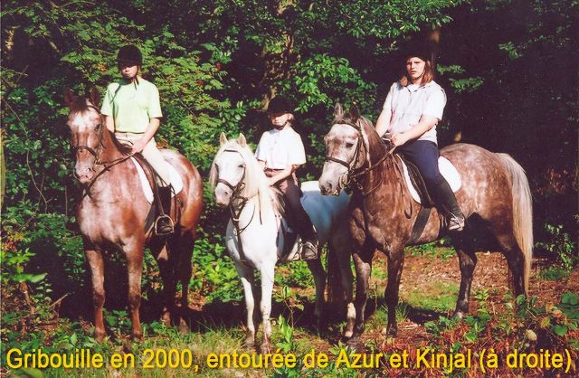 Gribouille est entrée dans l'écurie en août 1994. Achetée à un marchand en même temps qu'une autre ponette grise : Yeoudi. Cette Yeoudi a vécu trois ans chez nous. Elle avait une bouche merveilleuse, mais demandait une main moelleuse et précise. Pas vraiment la description d'une main de débutant ! Trop peu de petits cavaliers la montaient correctement. Yeoudi se défendait. Elle n'était pas faite pour l'école. Dommage, car c'était un excellent poney.