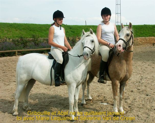 Gribouille était très liée à un autre poney, le hongre Abel. C'était le couple du manège. Installés dans le même box ou côte à côte en stalles, même en prairie, ils ne se quittaient jamais. On voit souvent, quand on observe la vie sociale des équidés, de telles amitiés profondes. Ce sont dans la majorité des cas un hongre et une jument qui passent ainsi leur destinée ensemble. Ces relations sociales entre eux sont une composante essentielle de l'existence des chevaux.