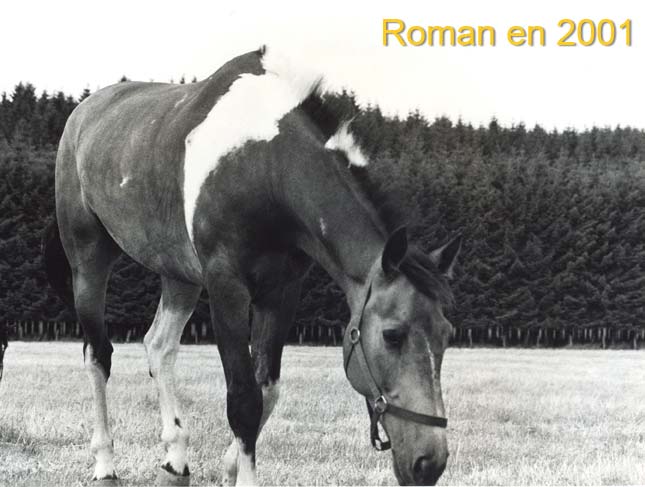 Roman endurait la galle estivale, une allergie due à des insectes. Généralement, une maladie qui s'aggrave d'année en année… Mais surprise, le gentil Roman qui était fortement atteint à 5 et 6 ans a vécu un processus inverse. Chaque été, il devenait moins sensible aux allergènes ! Il est maintenant pratiquement guéri, sans traitement. C'est le seul cas semblable que je connaisse. Mystérieux, mais il y a tellement de domaines concomitants aux chevaux qui n'ont pas été explorés et encore moins élucidés que cela ne m'étonne pas.