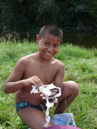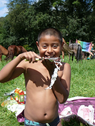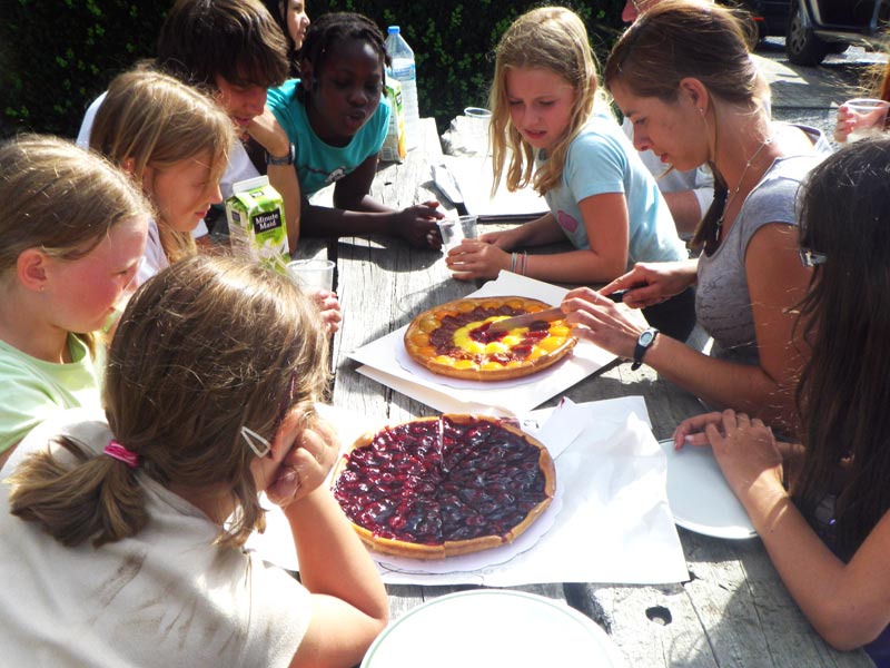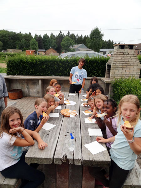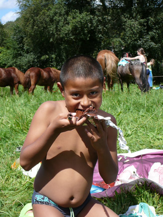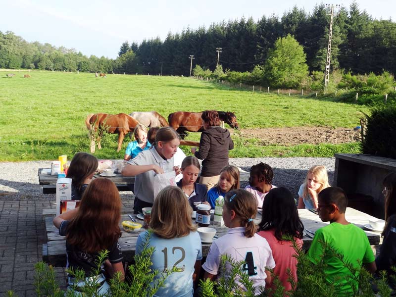 Nous avons pris tous les repas à l’extérieur ! Soit des pique-niques pendant la promenade, soit sur la terrasse près des poneys comme on voit ici.