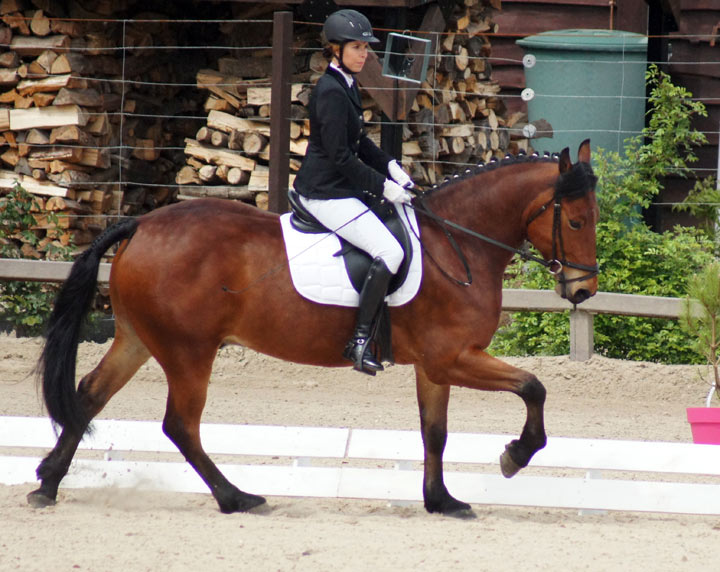 Vers mars 2011, Marie Lequarré l’a débourré très aisément, « le plus facile de tous ceux que j’ai faits ! » Puis, grâce à Marie Lonay, le poulain a enfin pu vivre quelques mois tranquilles au pré, comme cela se devait. Cet hiver 2011-2012, il est confié à Stéphanie Schmetz afin de compléter son éducation. Il évolue au mieux de nos espérances. Une fois de plus une satisfaction due au travail d’équipe. (février 2012) |